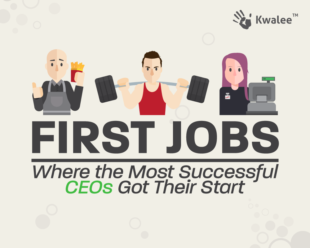 Infographic of what the first jobs of CEOs were. Some first jobs include door to door salesman, snow shoveller, and magician.